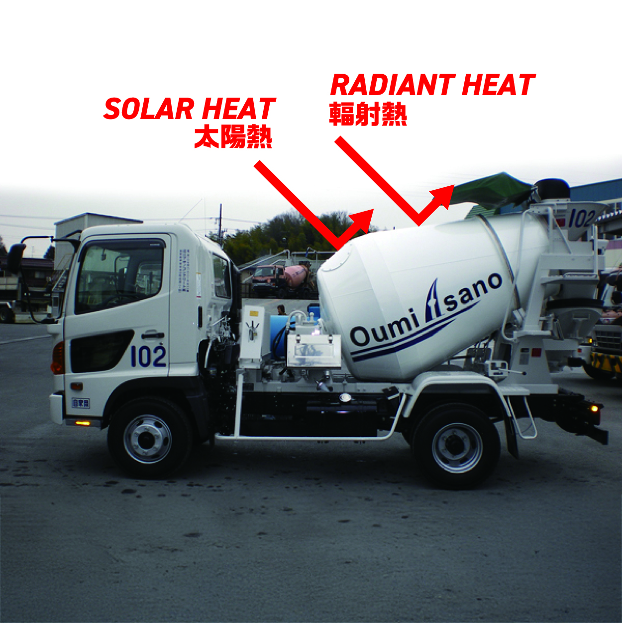 ●コンクリートミキサー車ドラムに塗装することで、ドラム表面の温度上昇を約20℃抑制