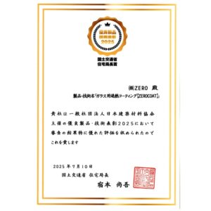 優良製品・技術表彰2025で国土交通省住宅局長賞を受賞窓ガラス用遮熱コーティングZEROCOATが受賞